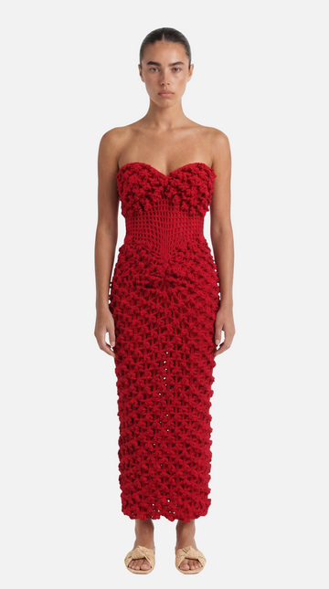 Make a statement. Own the room. This bold red crochet strapless midi dress is the...