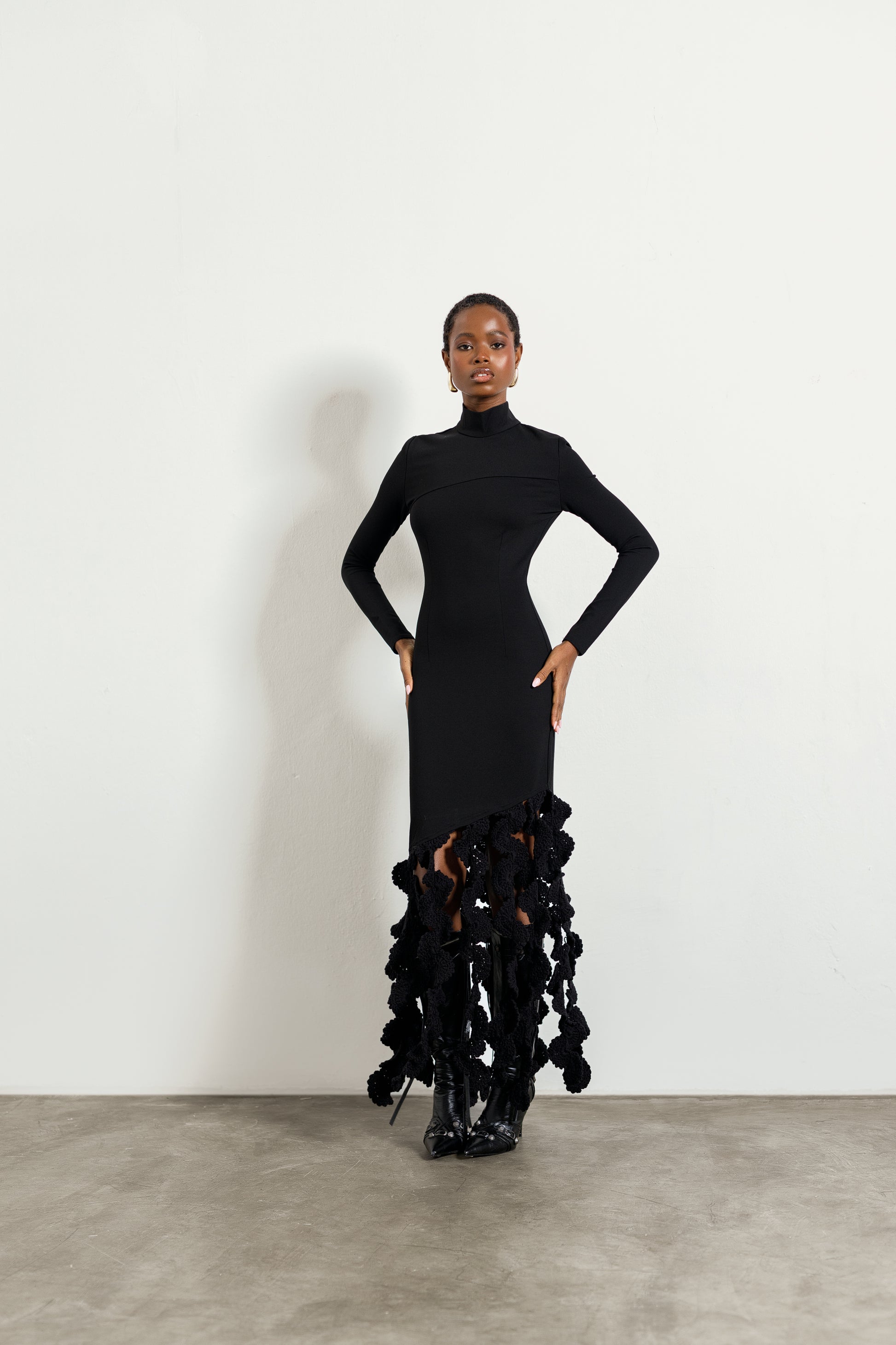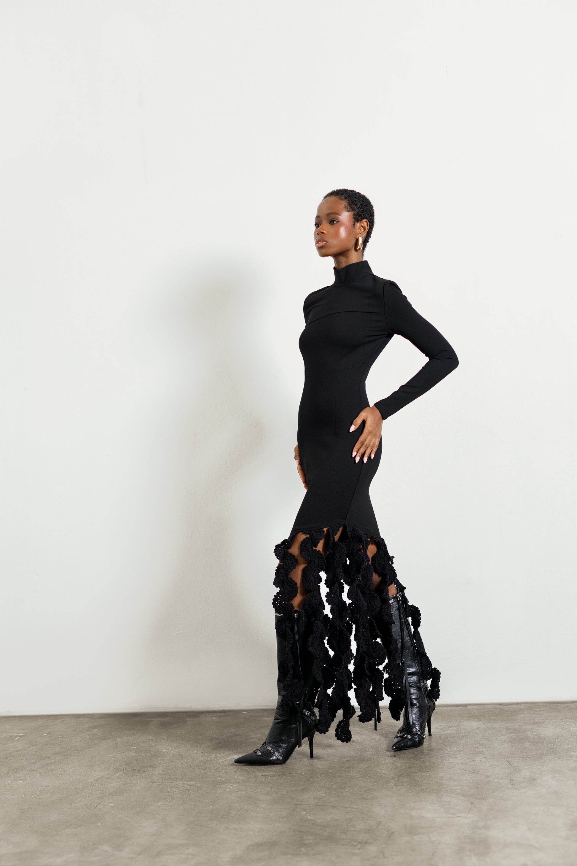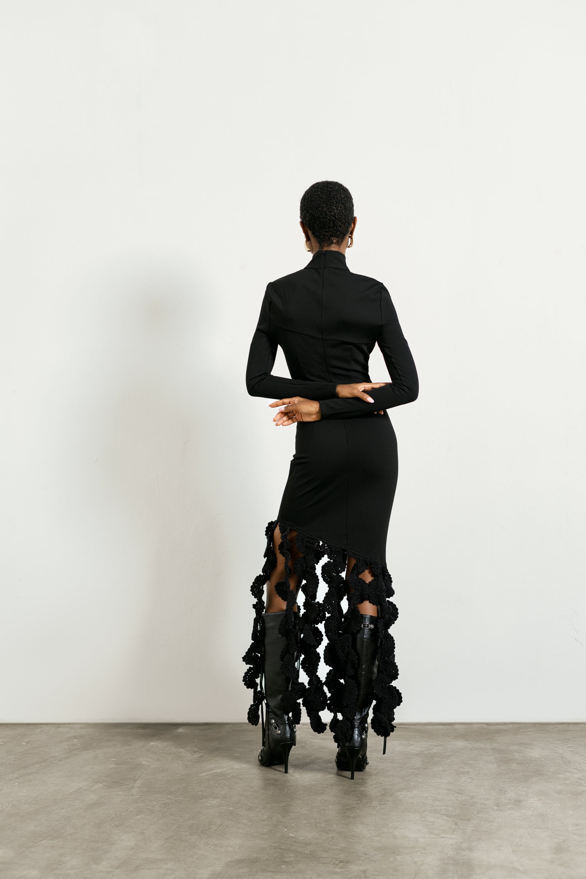 Dance the night away in our sensational black dress with crochet fringe. This cocktail stunner blends sophistication and boho chic flawlessly.