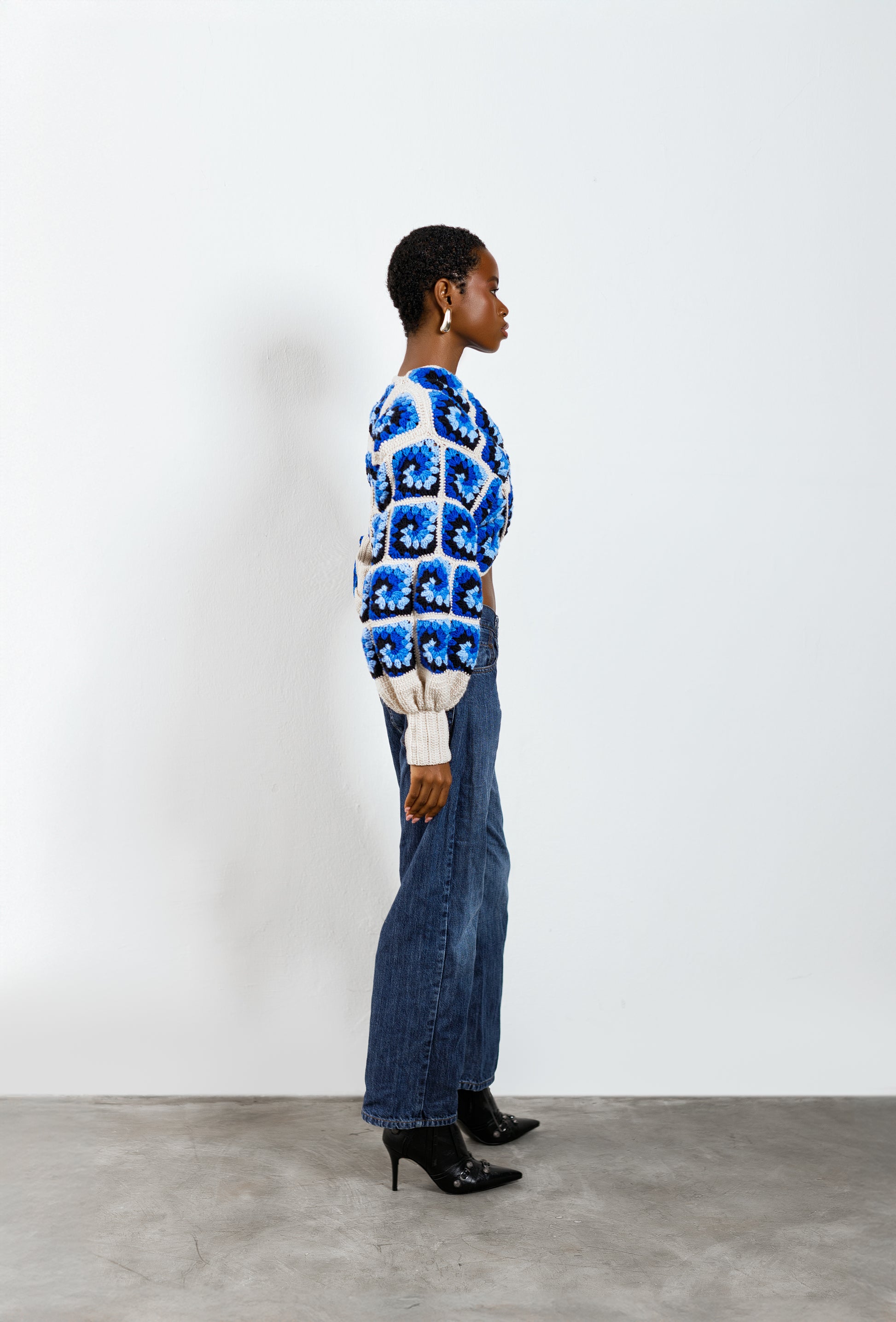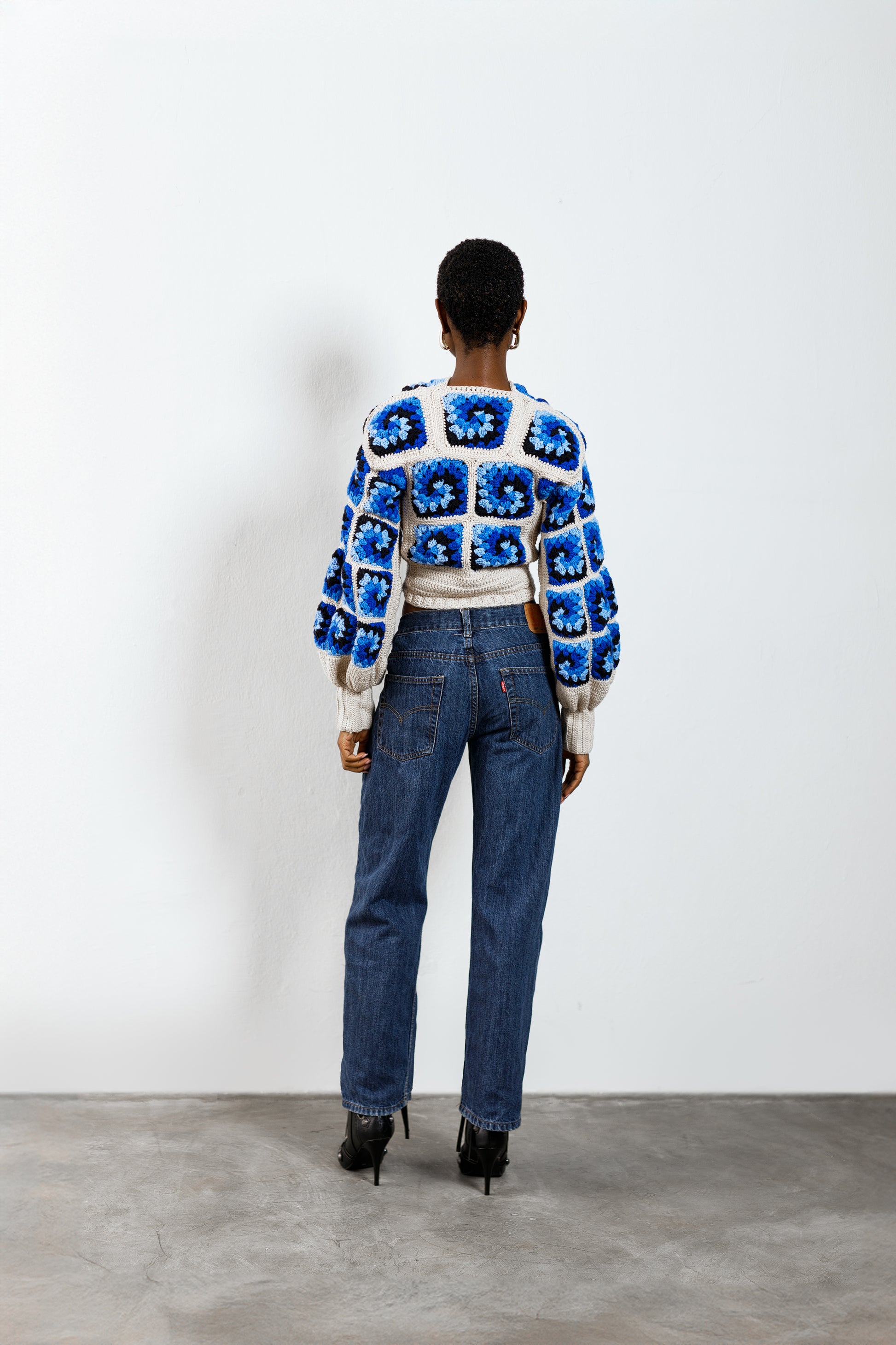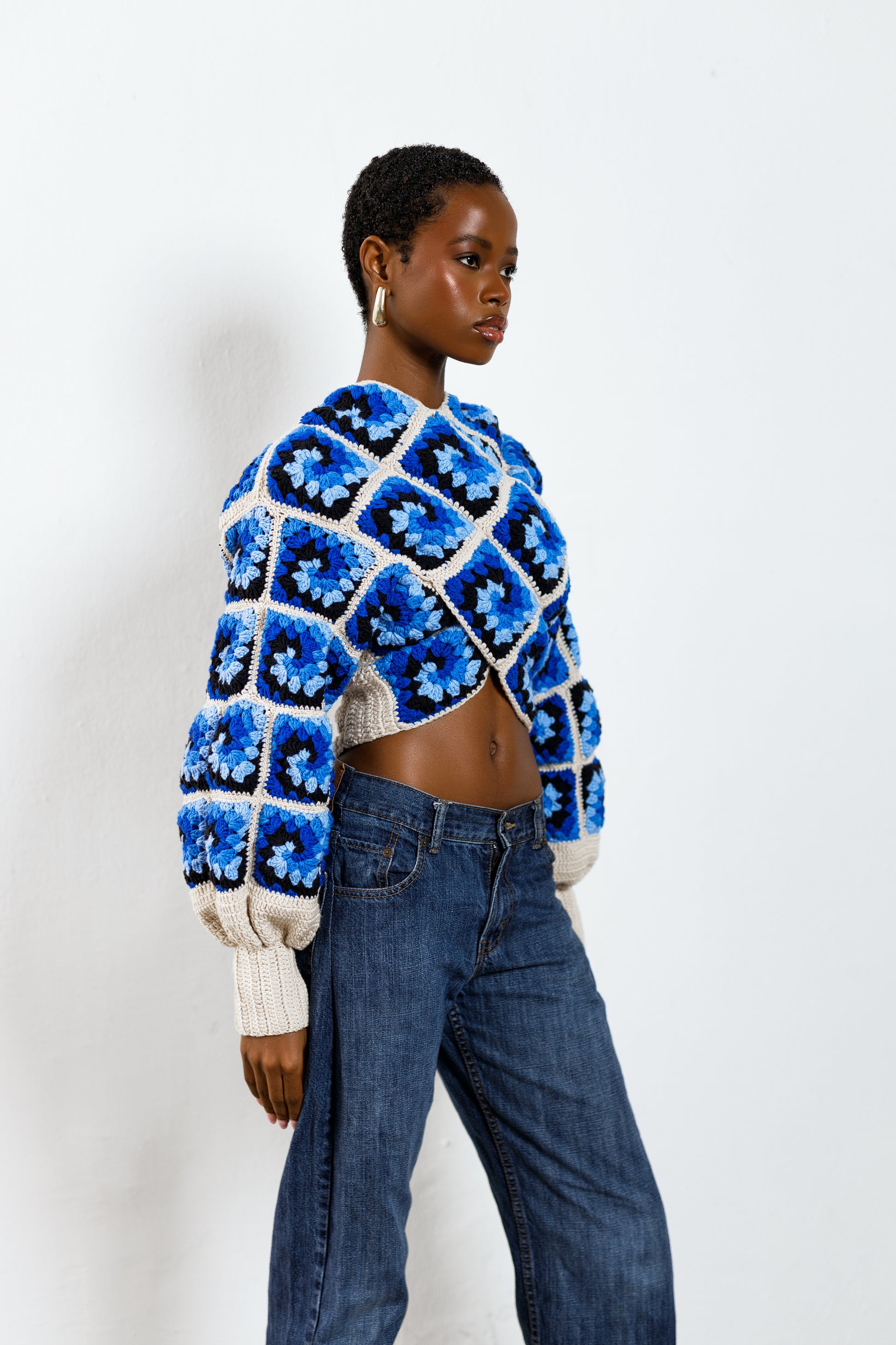 The best selling Amelia crochet sweater now comes in a blue granny square color way, she is perfect for fall. Amelia is crocheted by hand, meaning each one is unique. No two are alike.