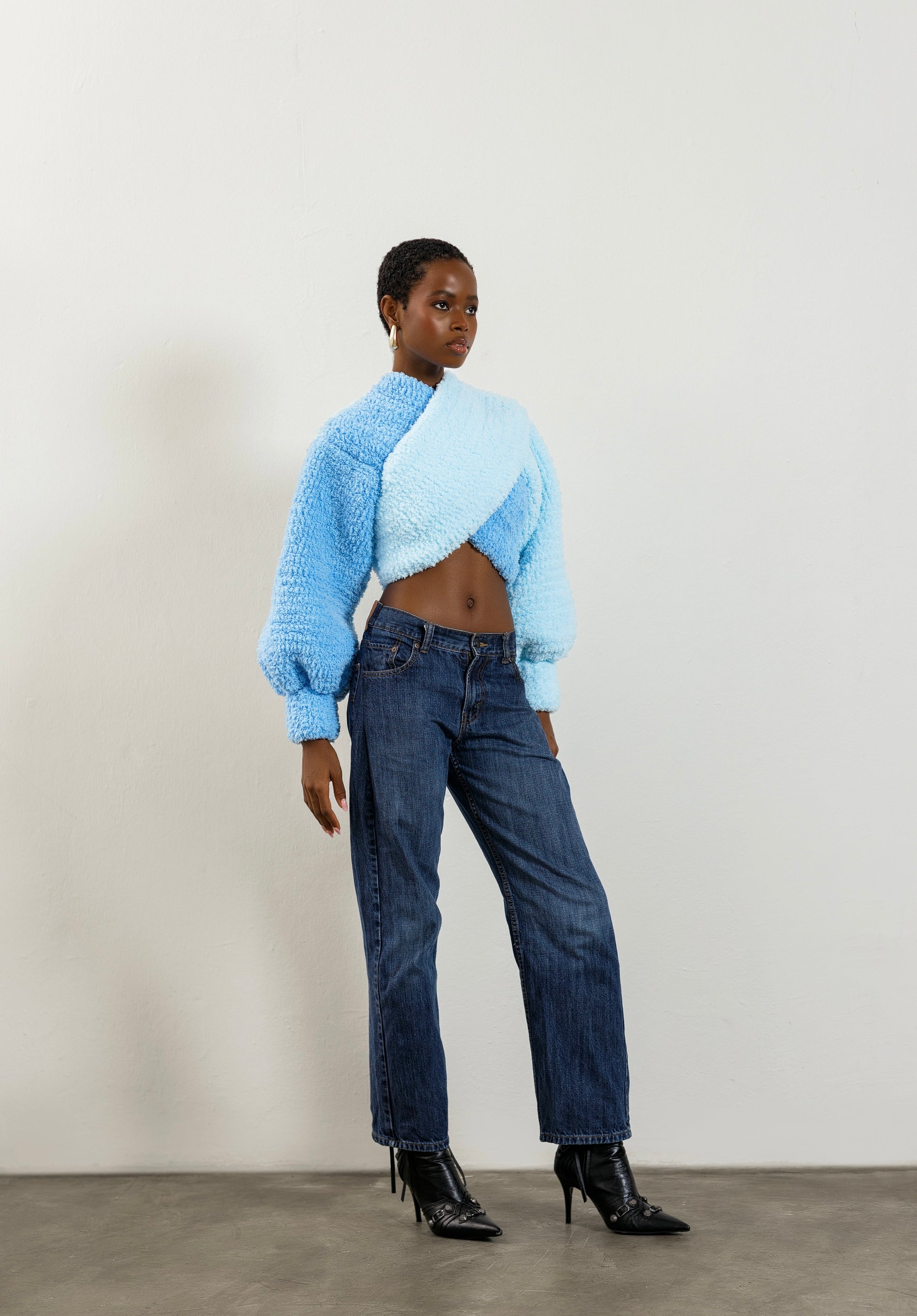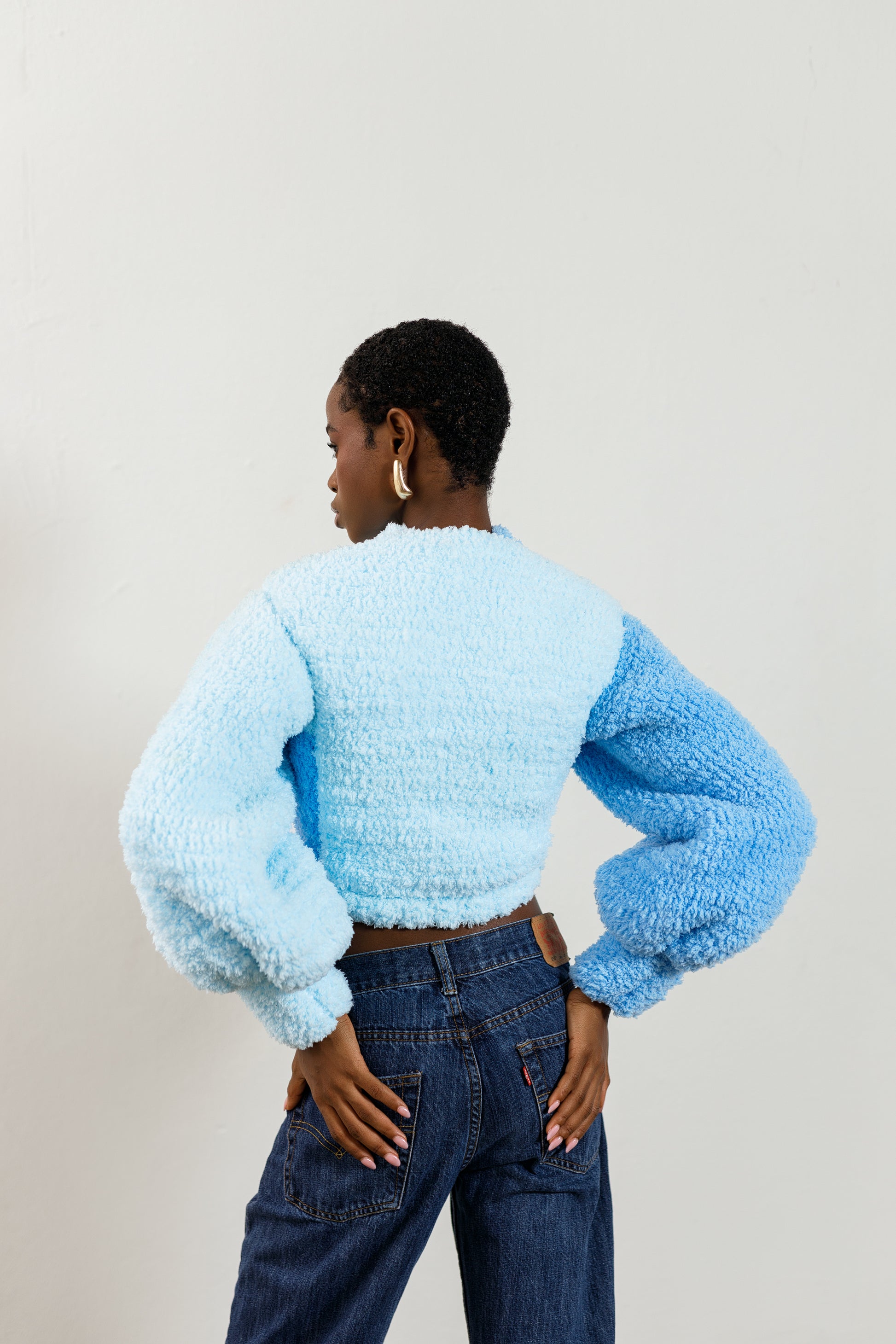 The best selling Amelia crochet sweater now comes in a fuzzy blue color way, she is perfect for fall. Amelia is crocheted by hand, meaning each one is unique. No two are alike.