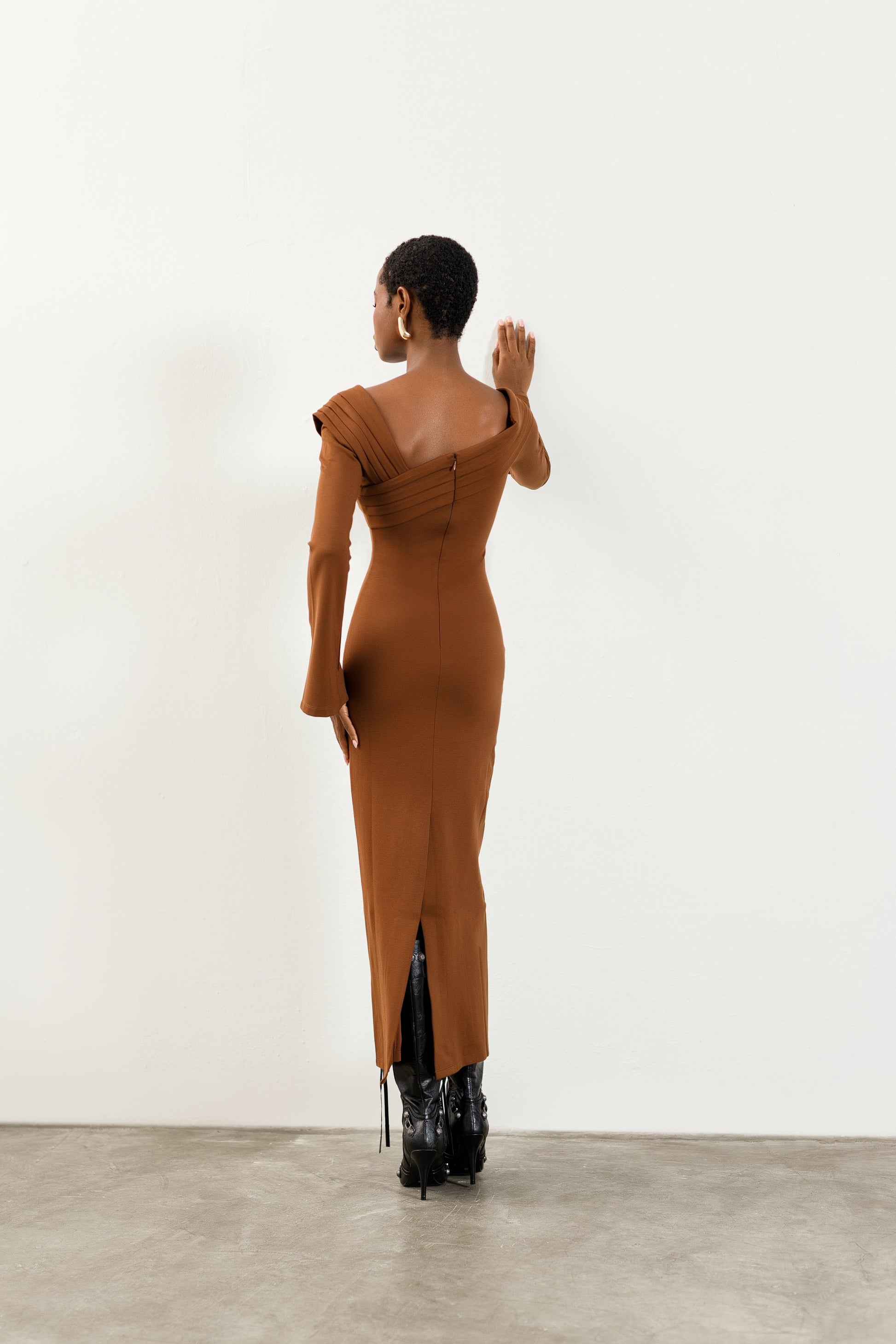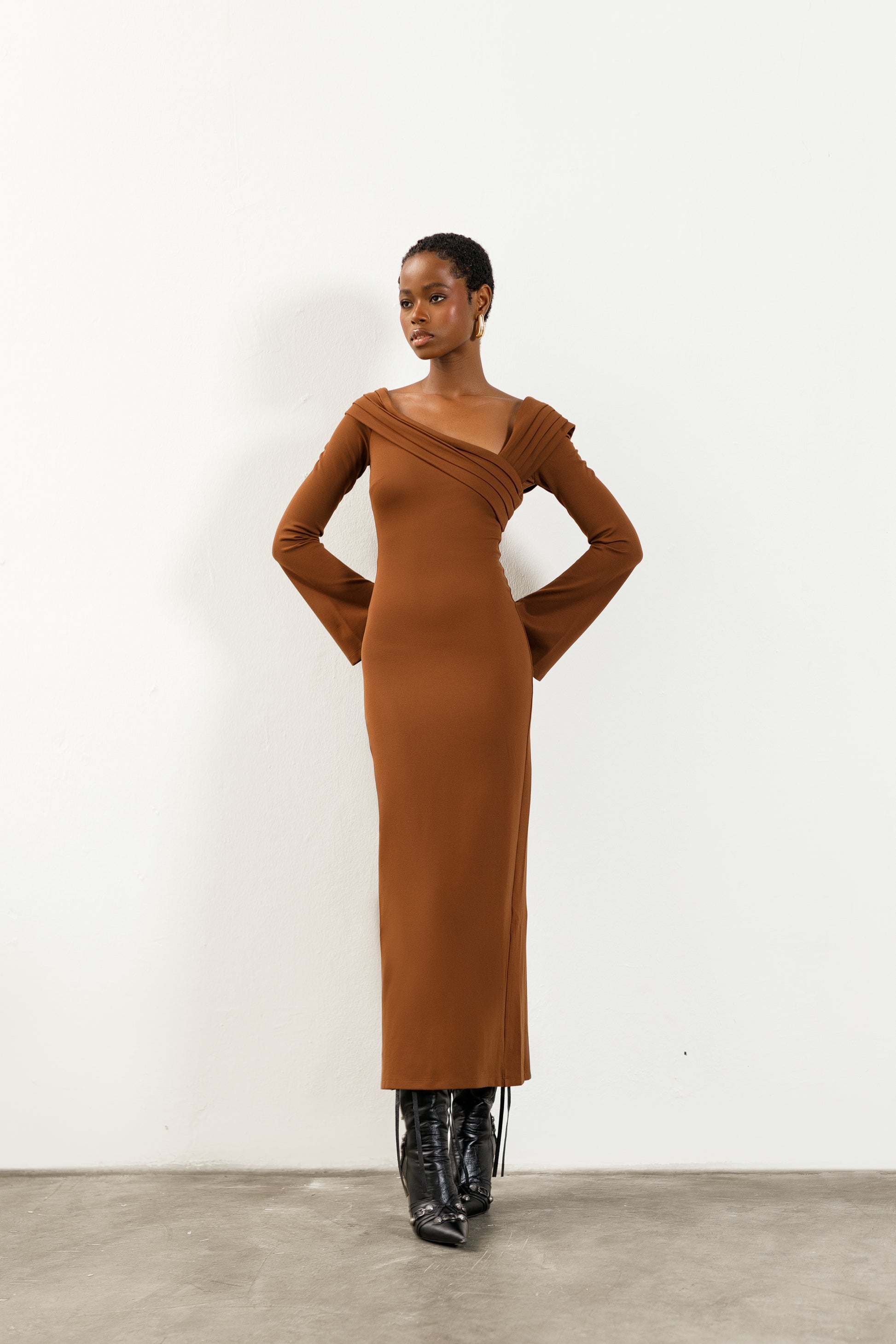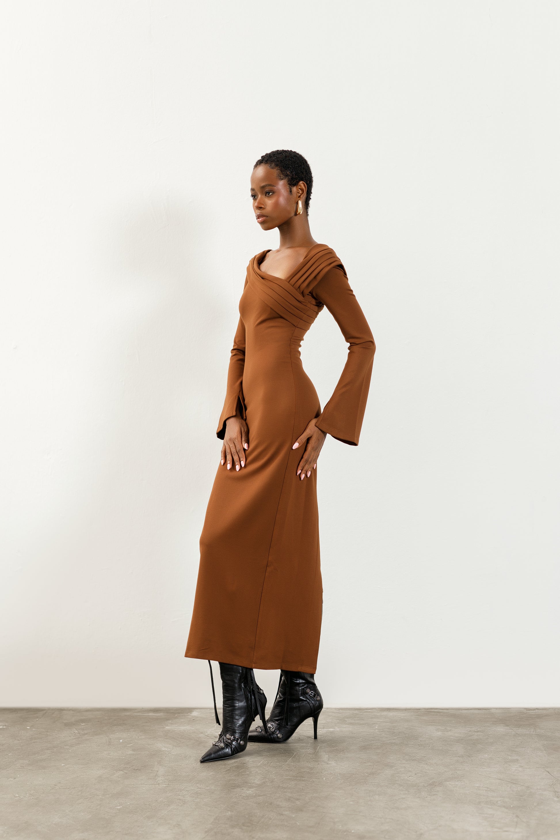 Elevate your look in the Enugu Dress, a midi stunner with modern, feminine flair: