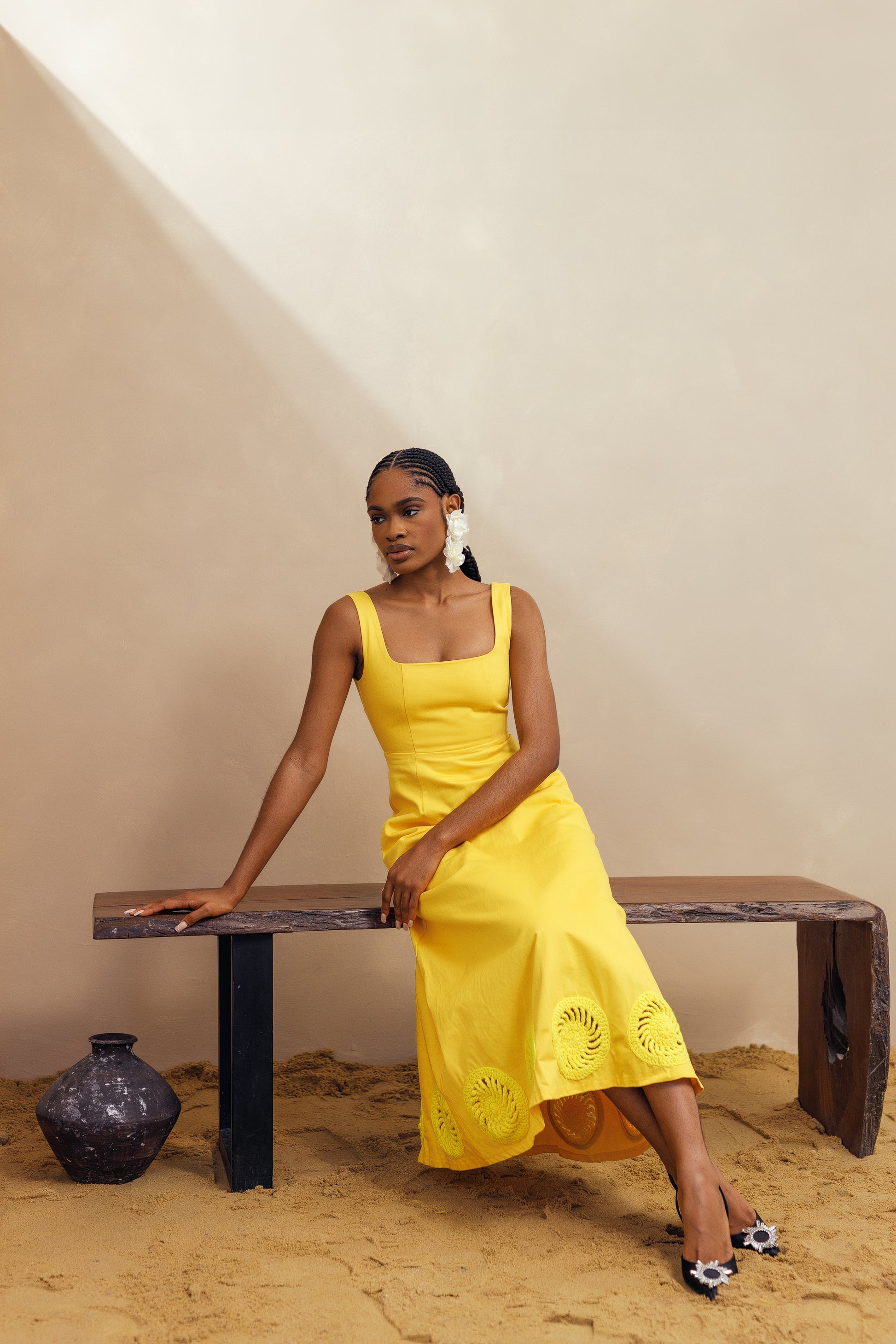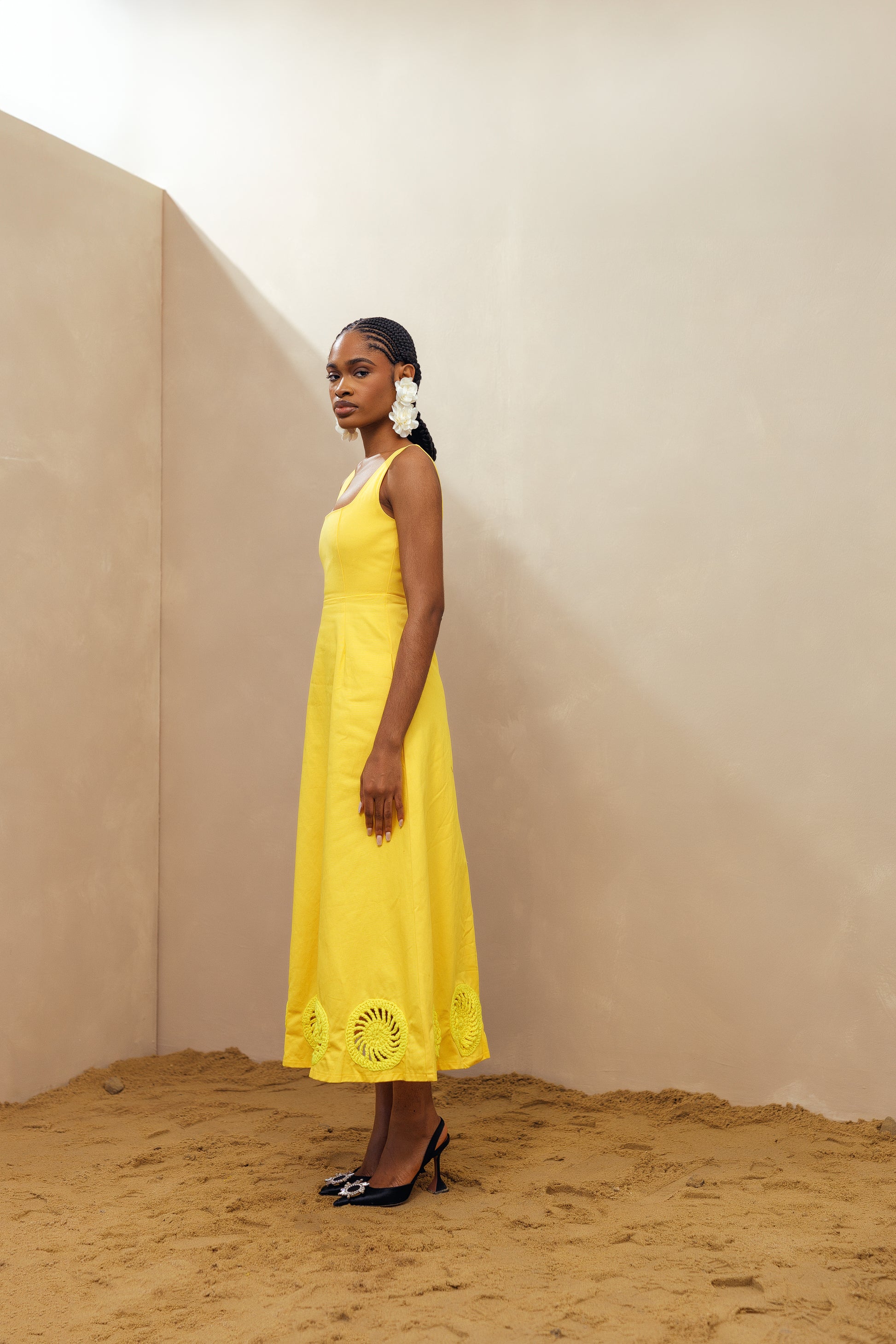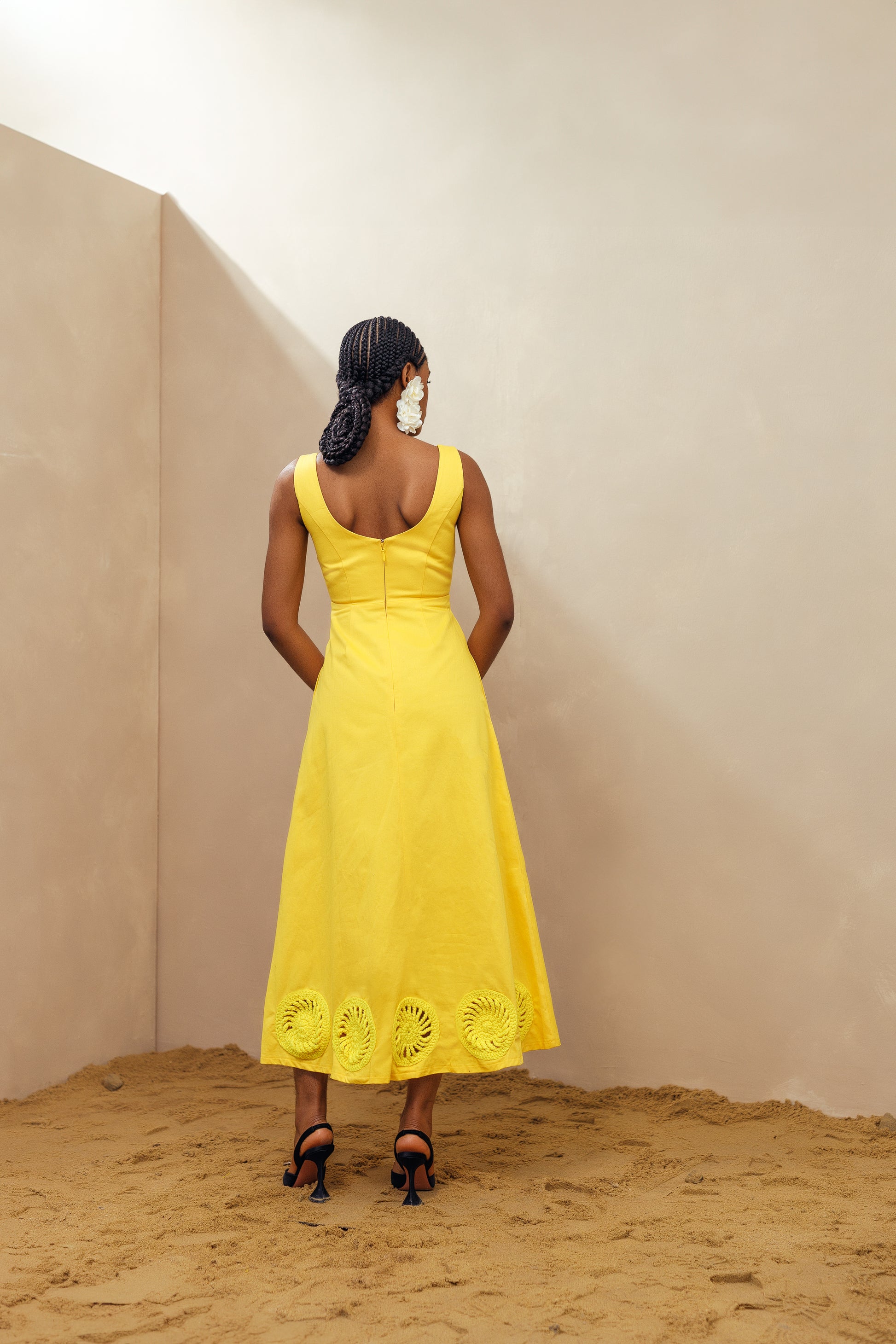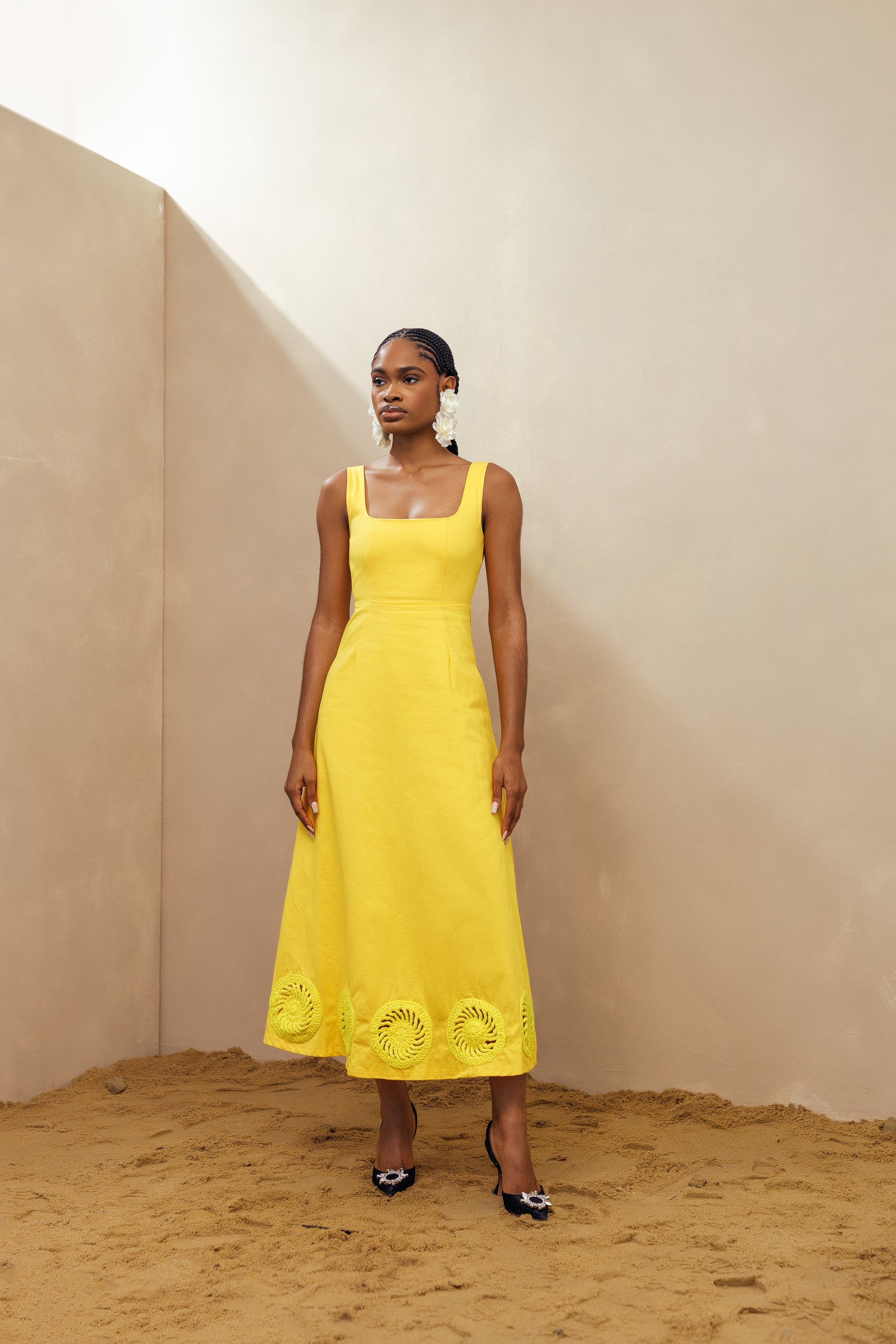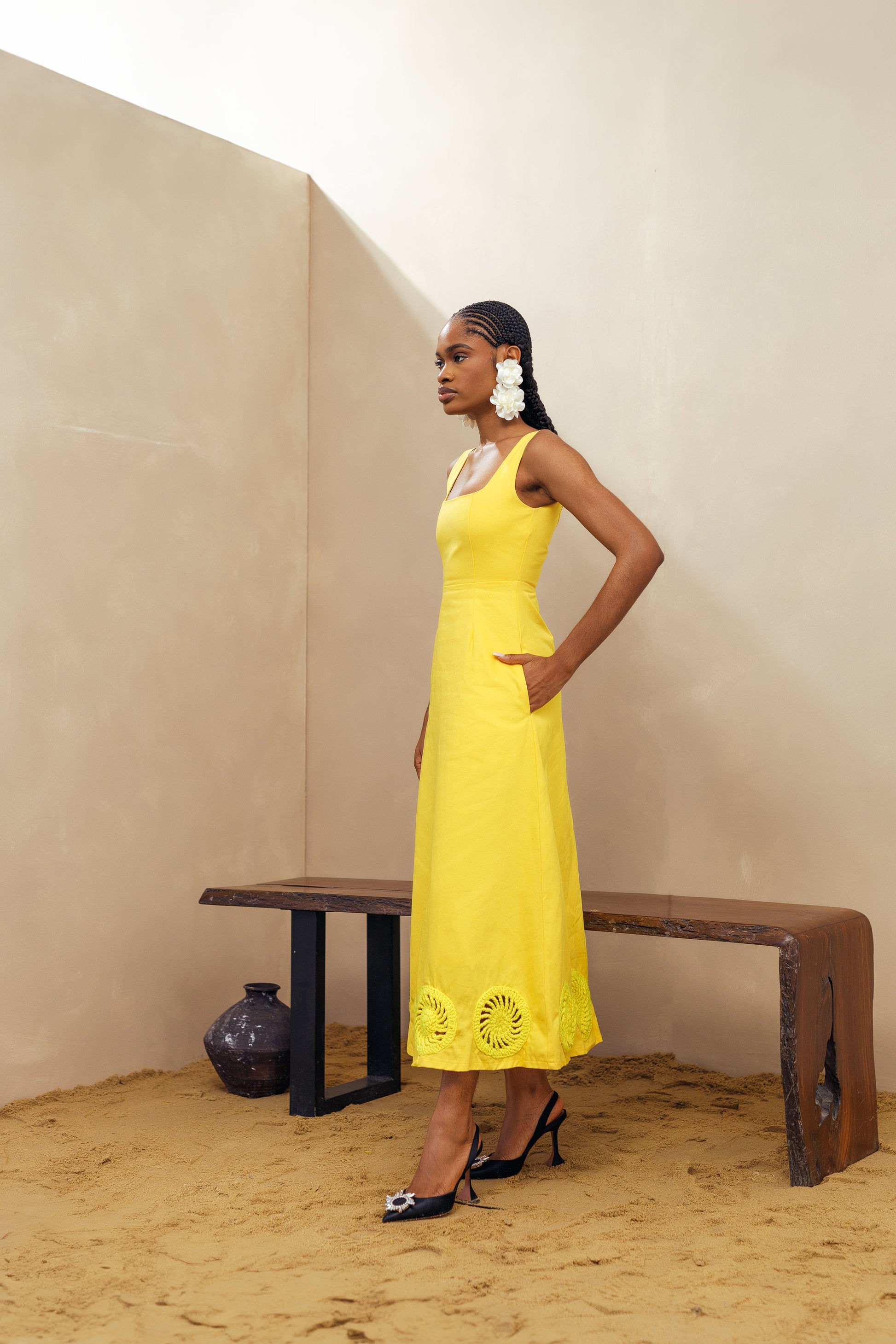 Elevate your summer style with our Kwara Dress. Hand-crafted by artists in Nigeria, this sundress features stunning crochet details along the hem. With a square neck and sleeveless design, this 100% cotton dress is perfect for your next weekend getaway. Stay cool and stylish with this must-have piece with pockets.