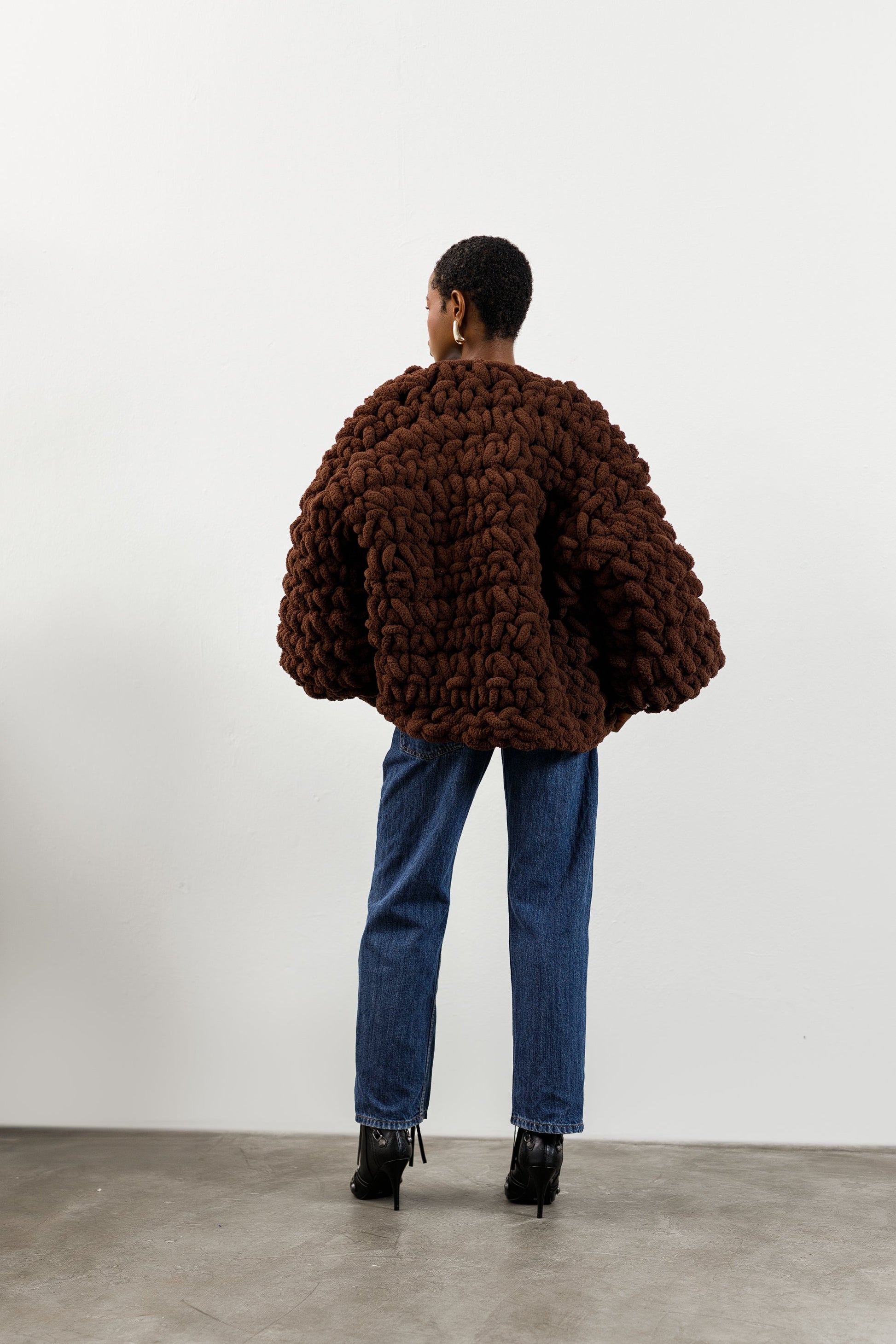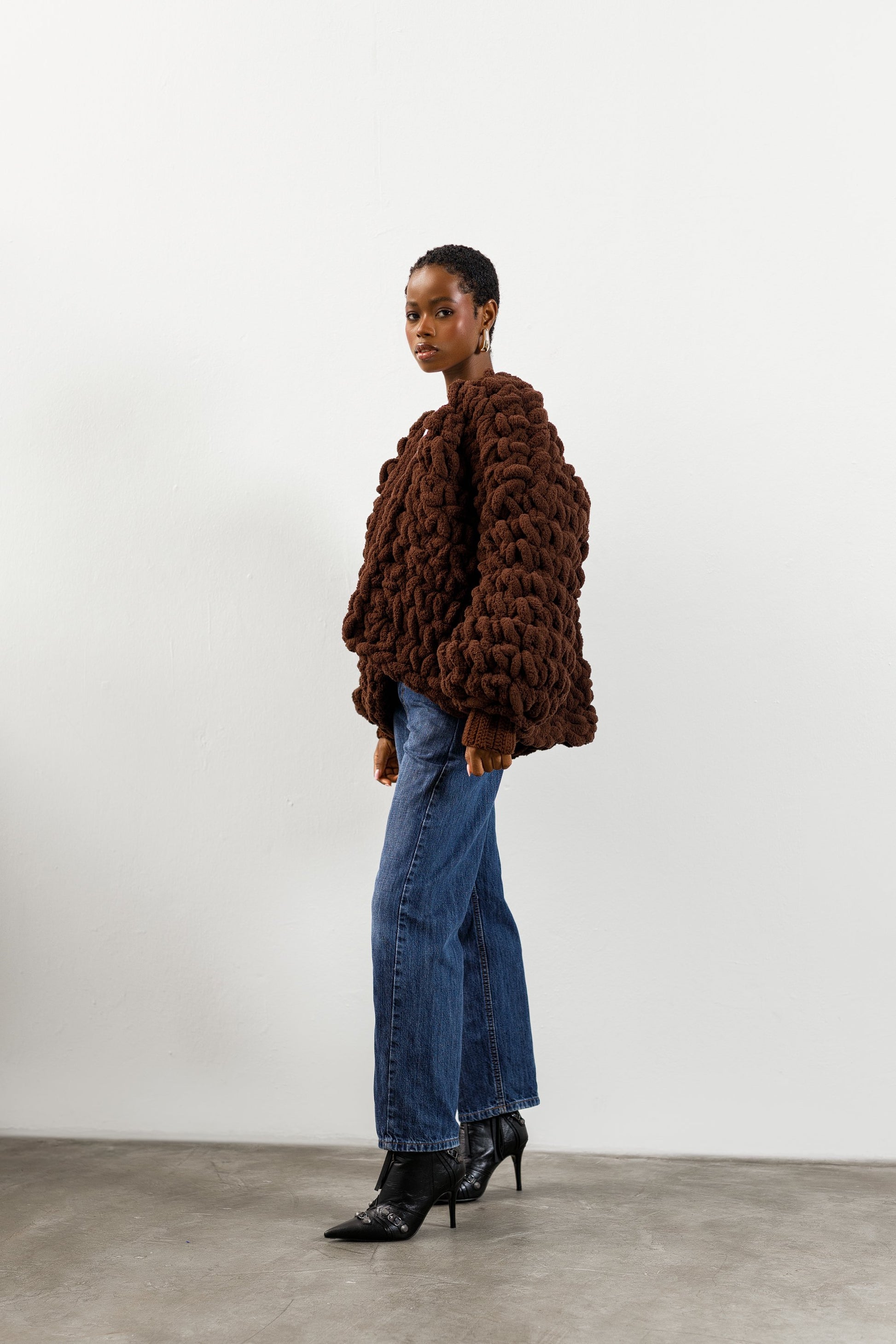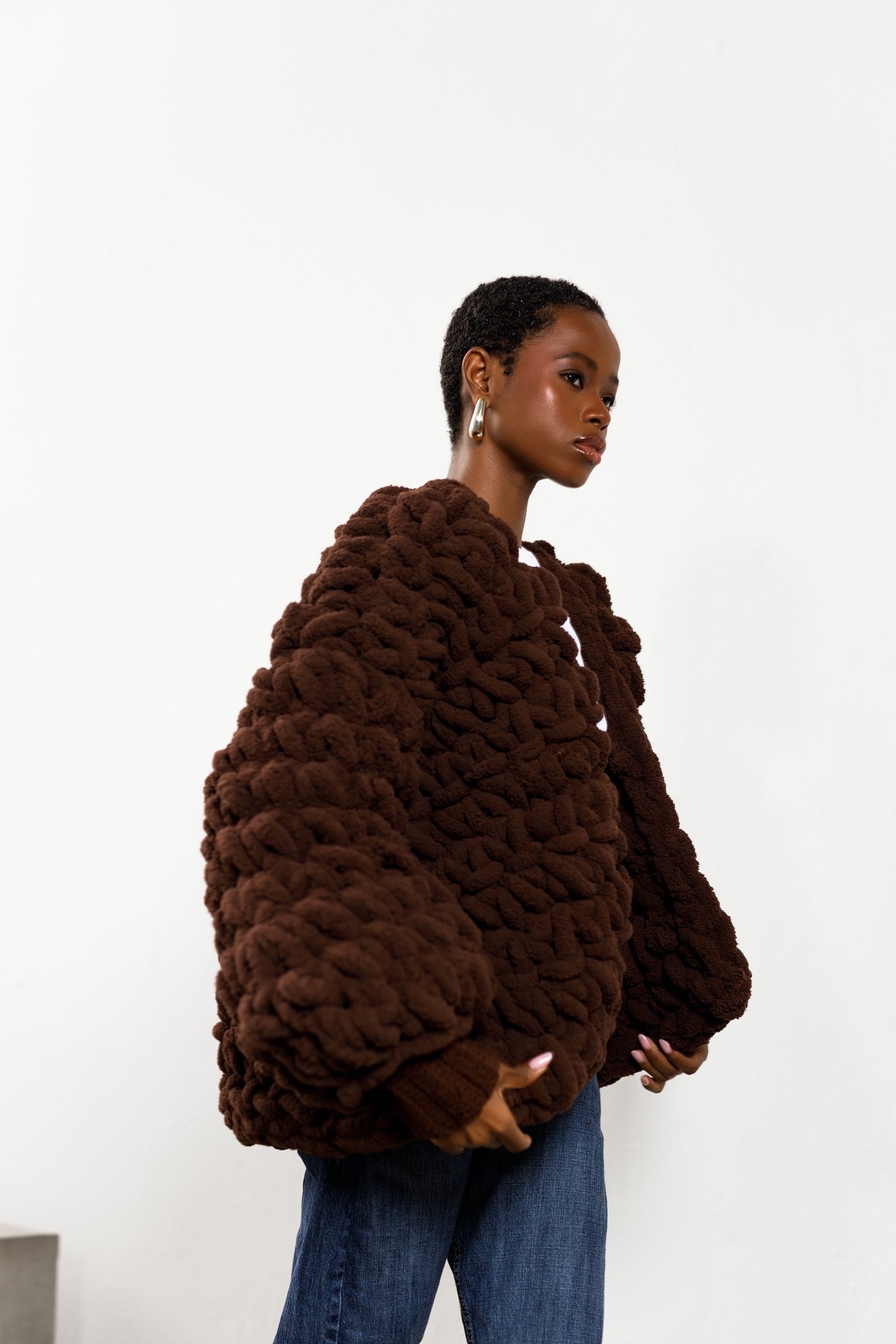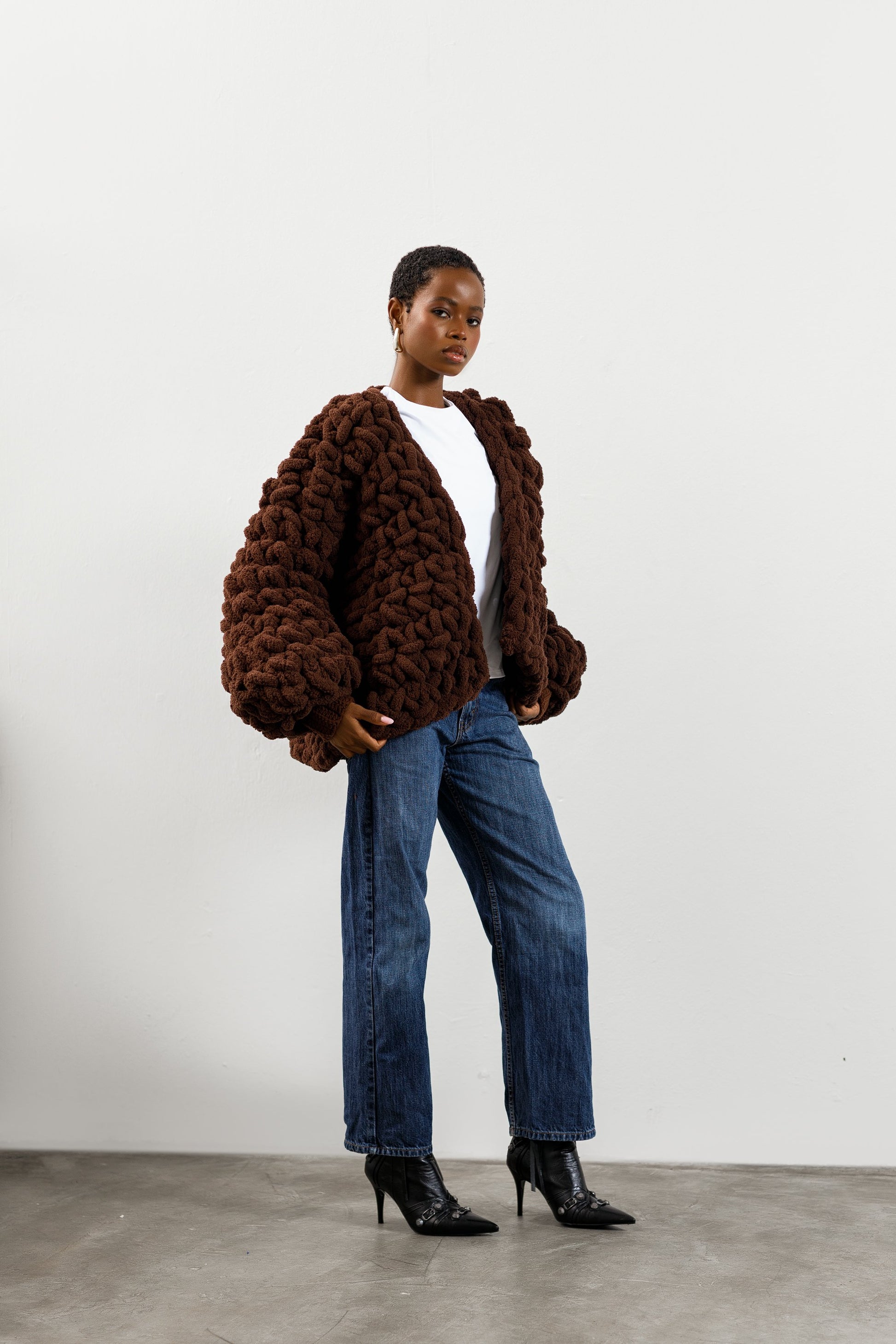 Moni crochet cardigan is sure to keep you feeling fuzzy and warm. She’s handmade from the softest bulky yarn.