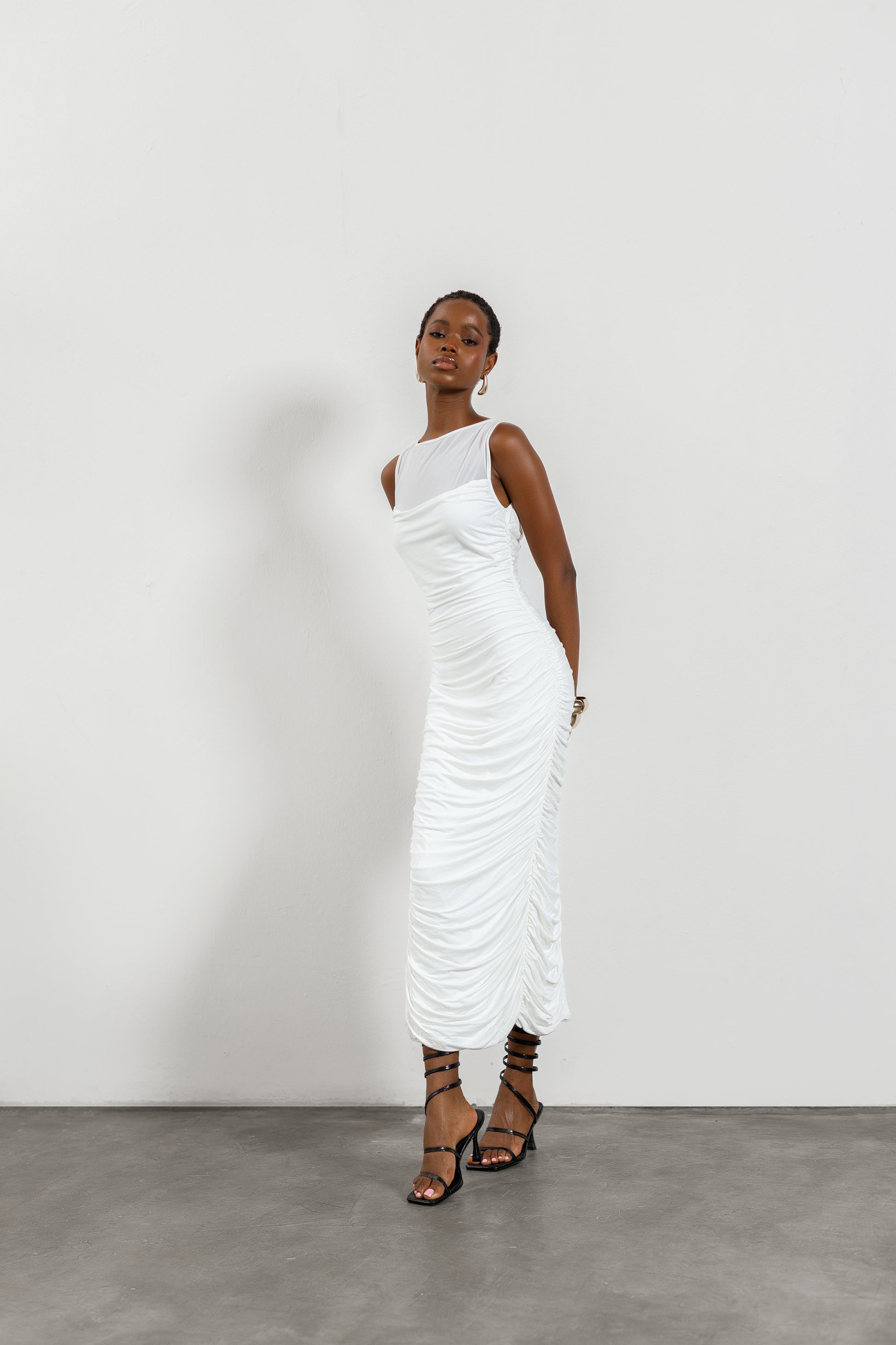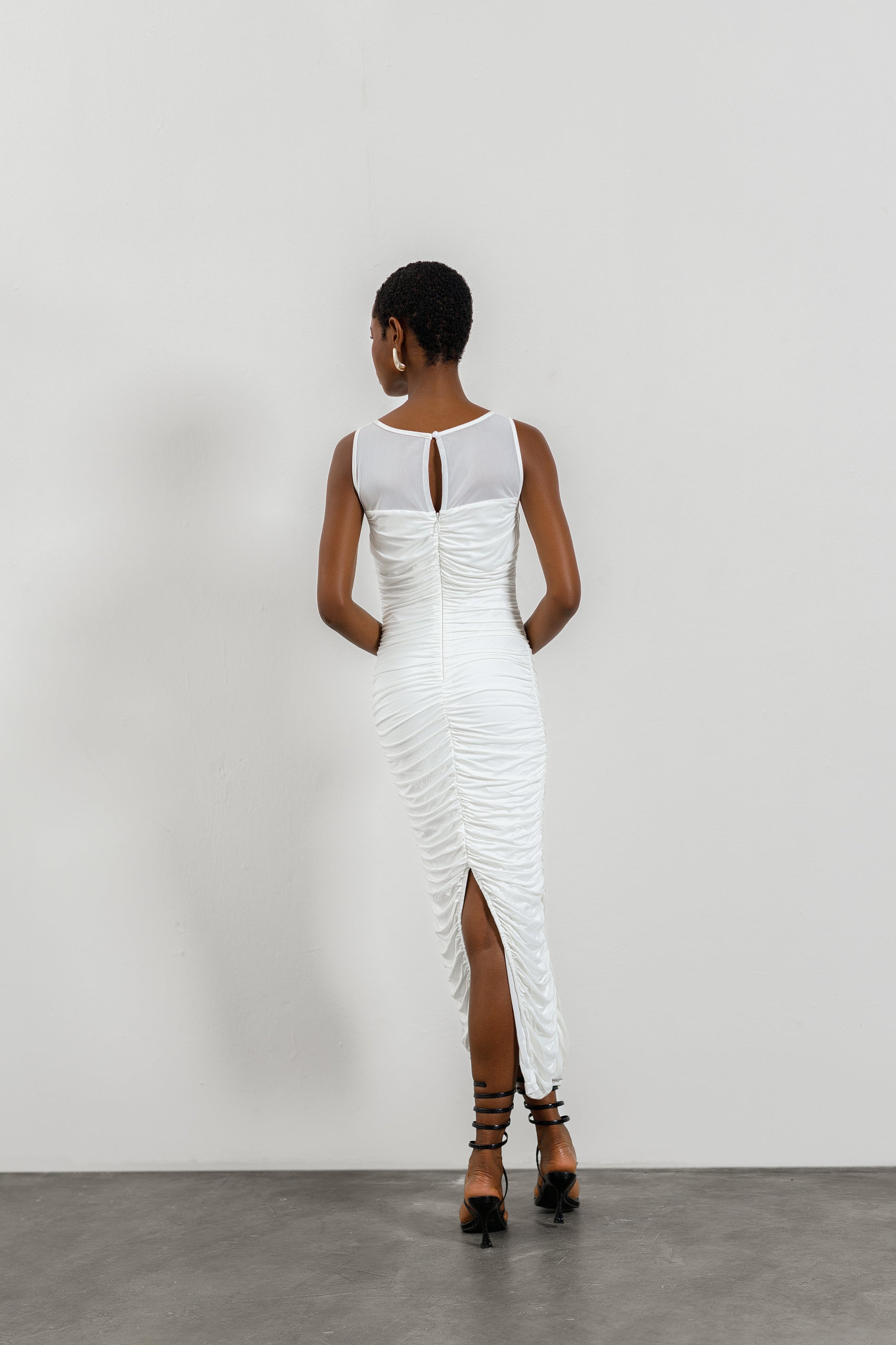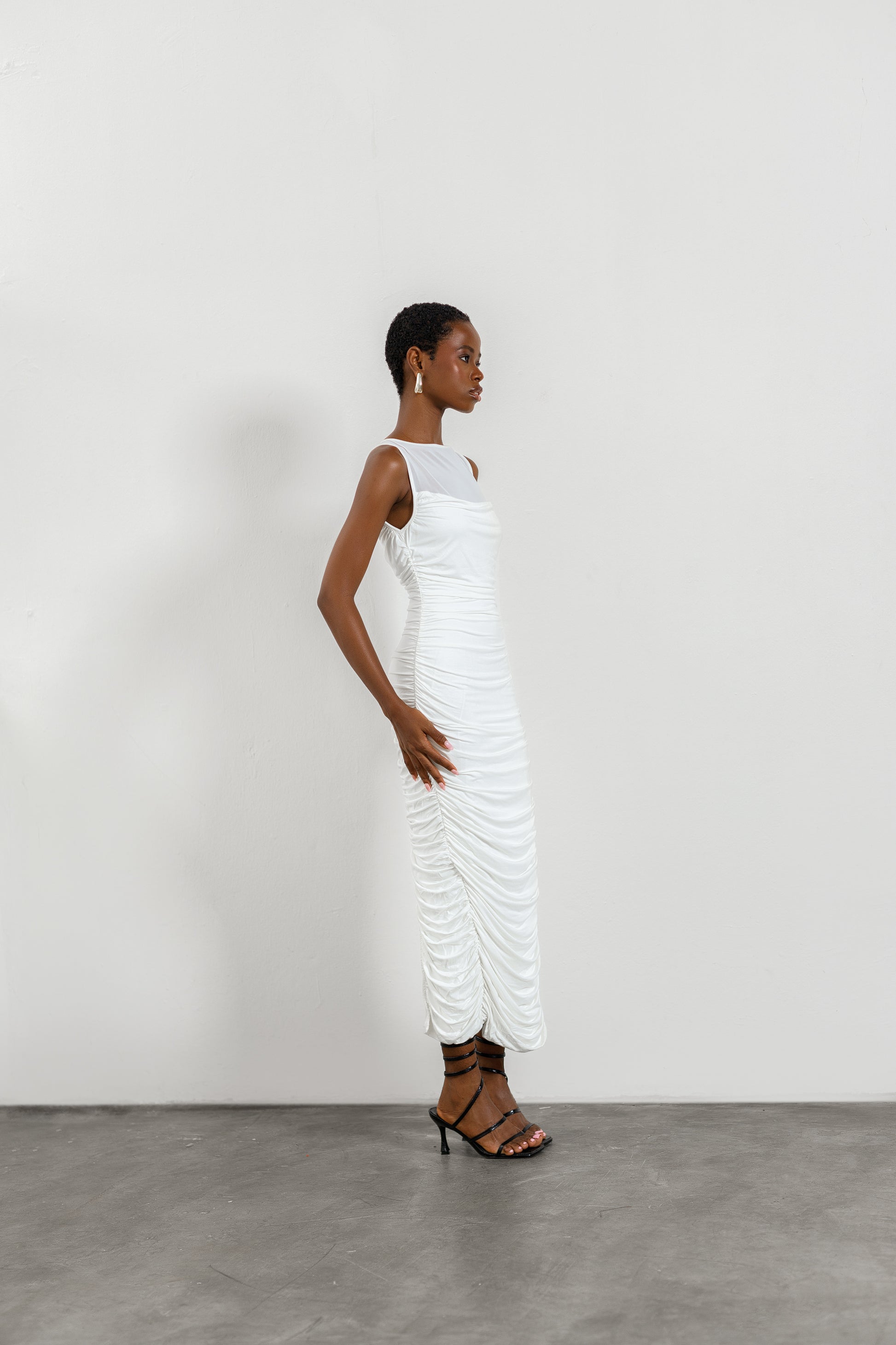 Crafted from a lightweight, super-stretch jersey blend of 95% modal and 5% spandex, the Venus Dress Blue offers both comfort and flexibility. Its sleeveless design features elegant mesh trim and ruching at the sides for a flattering silhouette. The midi-length dress includes a back slit for ease of movement, a crew neck, and a button keyhole with a zip closure at the back. Fully lined and designed for dry cleaning, this dress combines sophisticated style with expert tailoring.